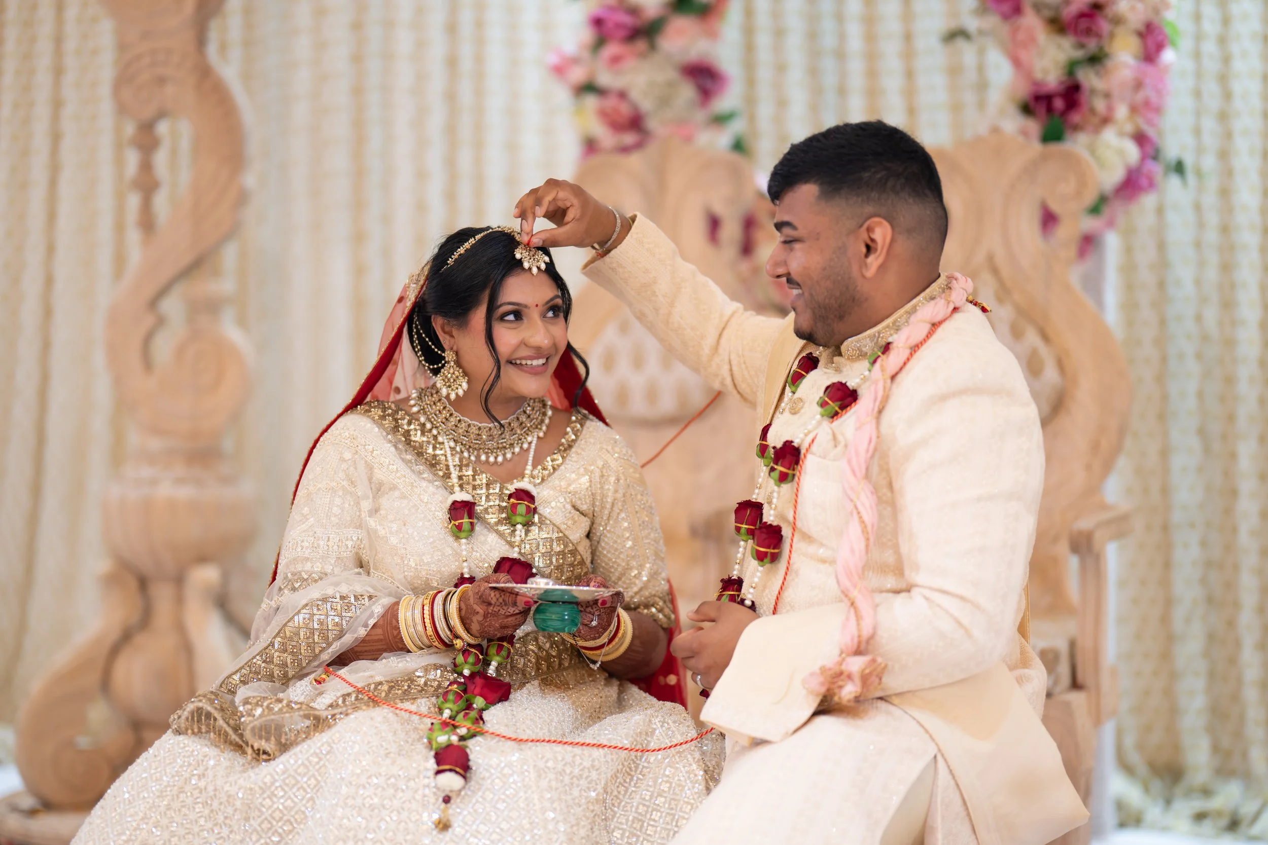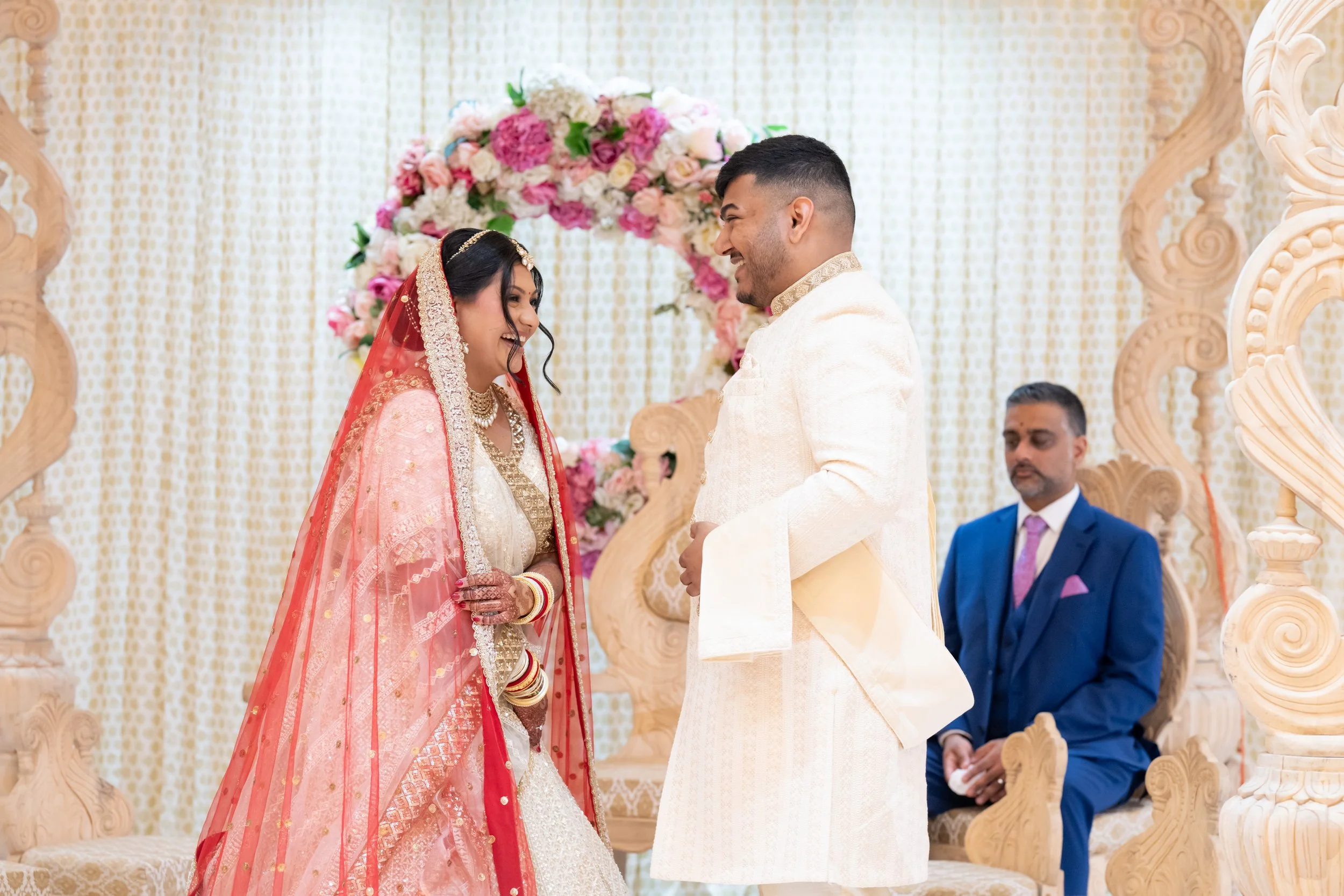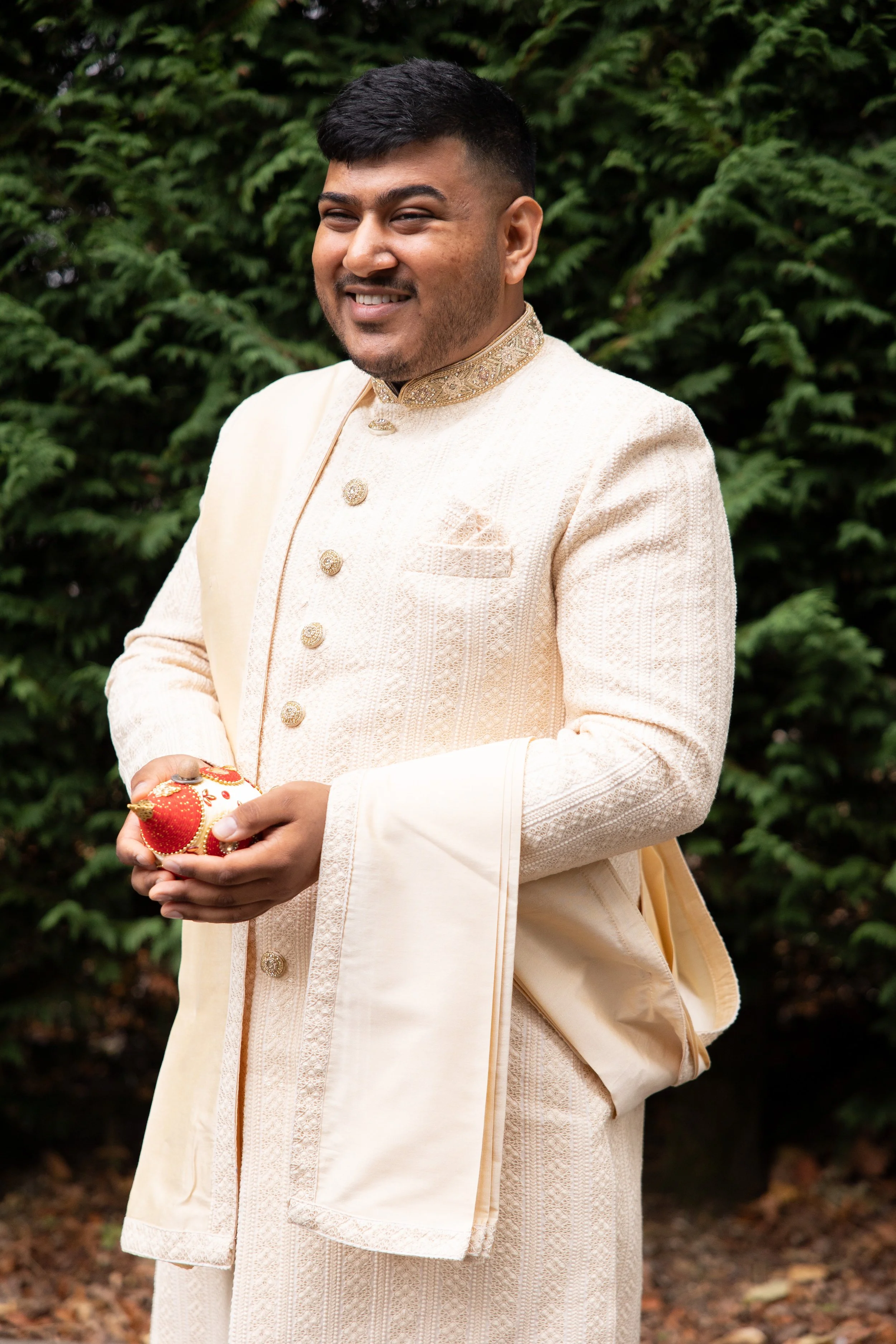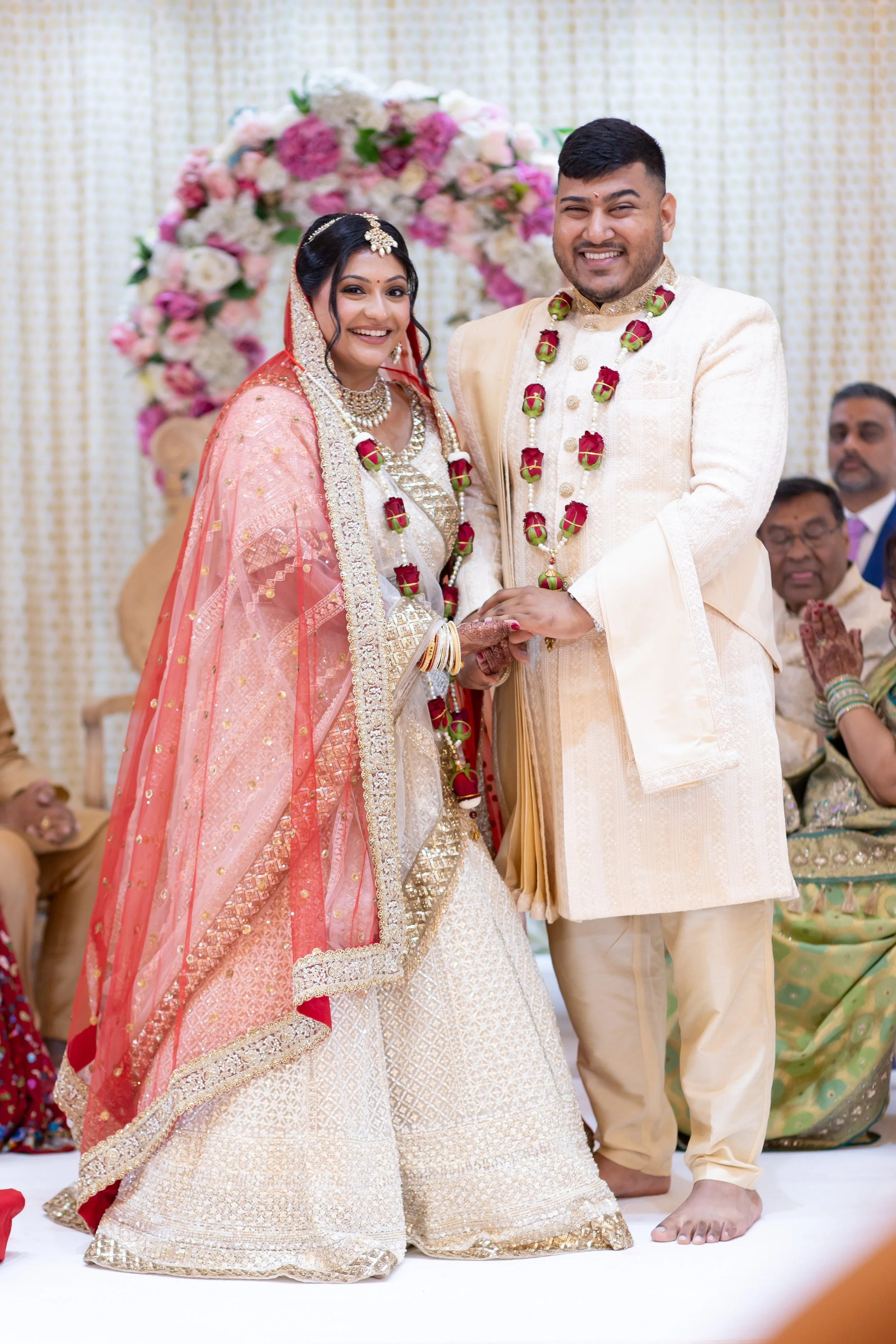 For their Hindu wedding ceremony at the Oshwal Centre, Potters Bar, the vision was clear: two outfits that felt harmonious, considered and entirely worthy of the occasion.